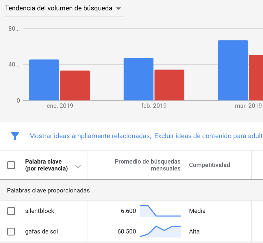 Como vemos en la imagen para el término «silentblock» nos indica un promedio de búsqueda de 6.600 y una competitividad media frente a «gafas de sol» con 49.500 búsquedas de usuarios y una competitividad alta.